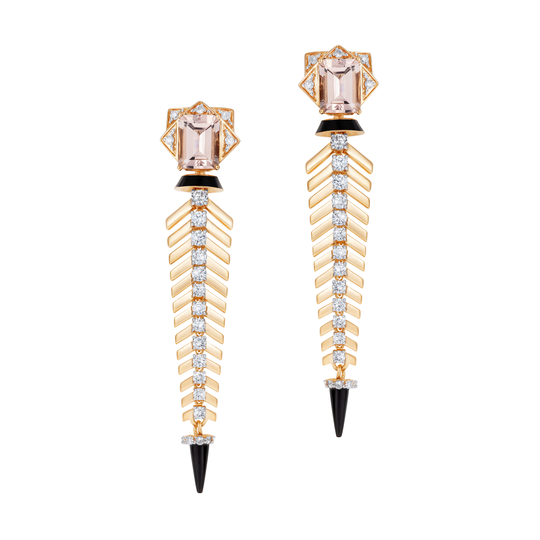 Our interpretation of what a female Pharaoh might wear to court, these dramatic art-deco drop earrings are crafted in 18kt yellow gold with morganites, diamonds and enamel detailing.