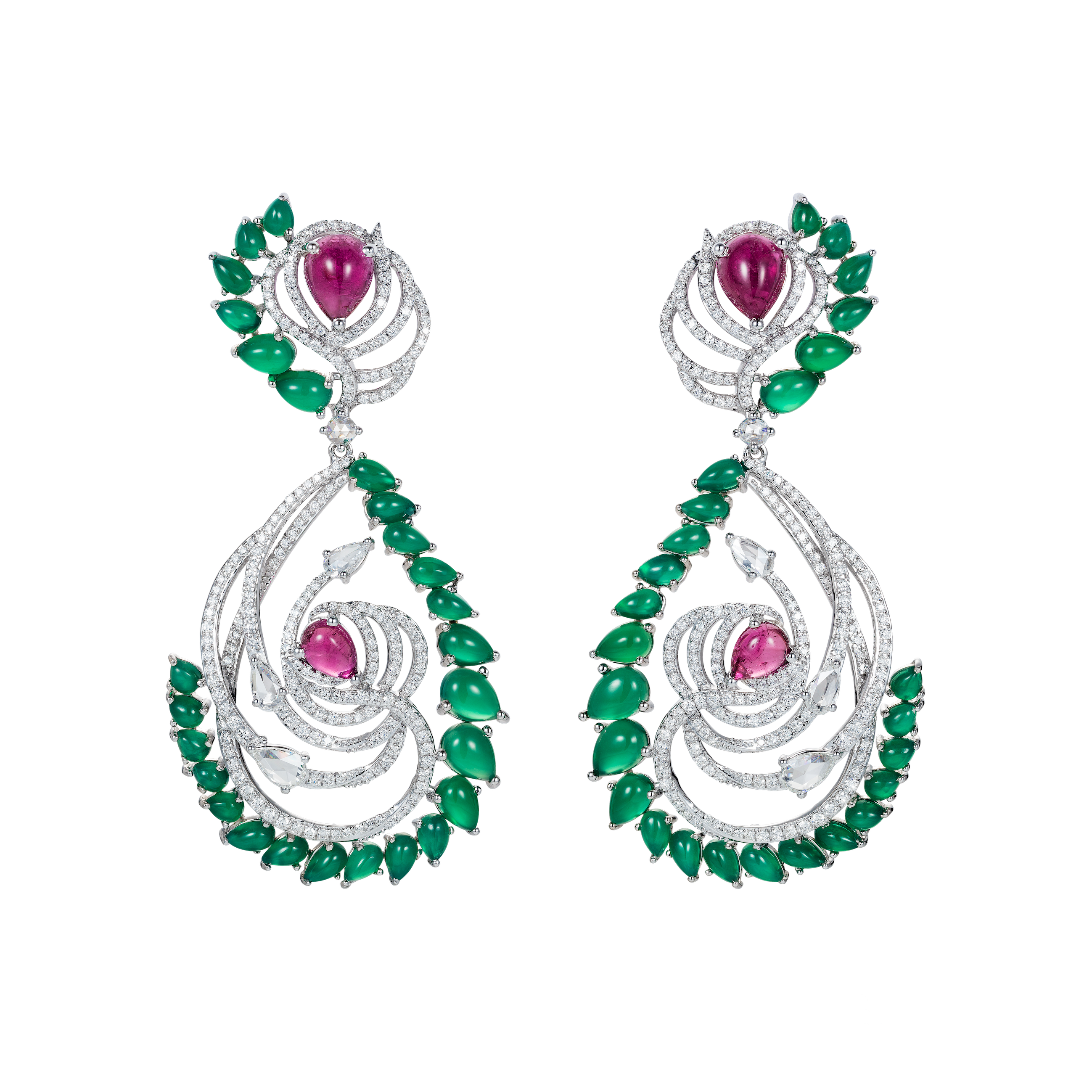 The Birds of Paradise is inspired by the vivid beauty of African avian life, crafted with rose cut diamonds accented by rubellite and chalcedony cabochon beads.