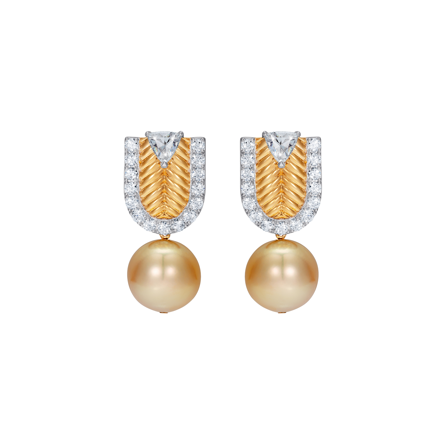 Taking their name from the ancient Egyptian term for metal weight, the Deben earrings feature textured 18kt yellow gold, trillion solitaires, brilliant diamonds, and glowing golden South Sea pearls.
