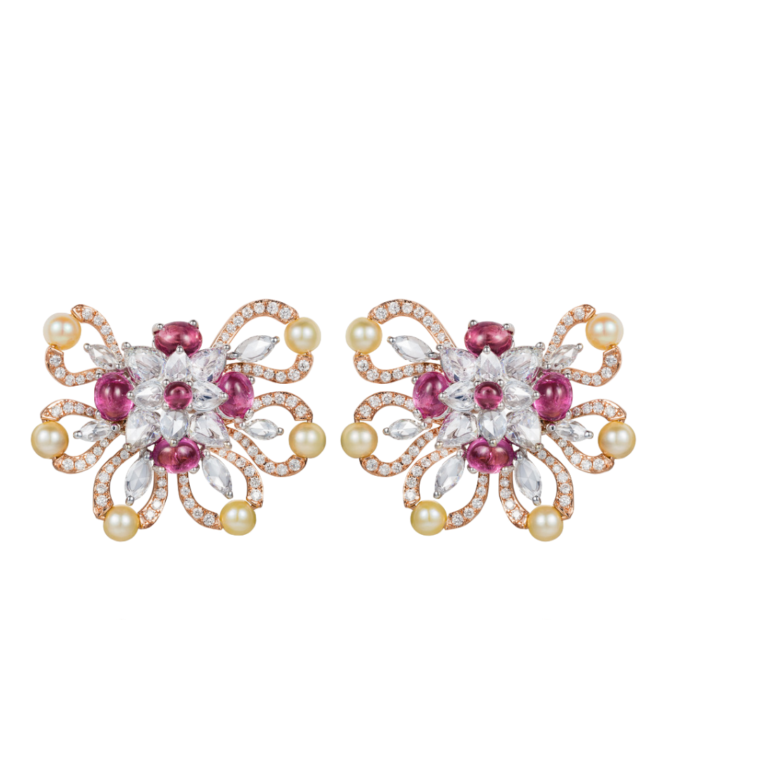 Drawing from the rich flora and fauna of the southern hemispheres, these refined diamond studs feature 18kt gold, paired with vivid rubellite cabochons and delicate pearl beads.