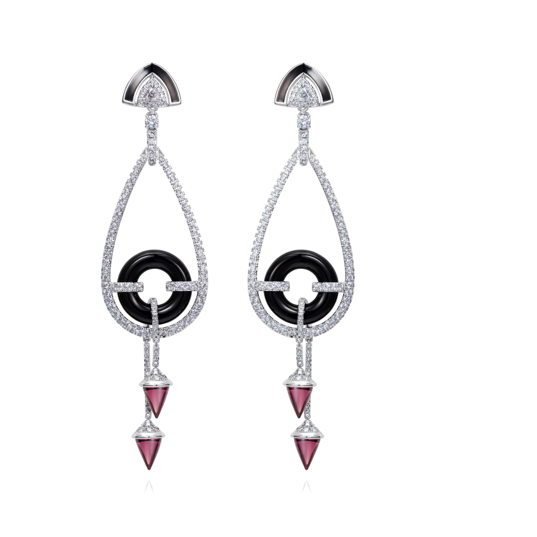 Modular Art Deco chandelier drops offering three ways to wear: dramatic chandeliers, sculptural pendants, or timeless studs. Expertly crafted in pavé white gold with polished onyx discs and rhodolite accents
