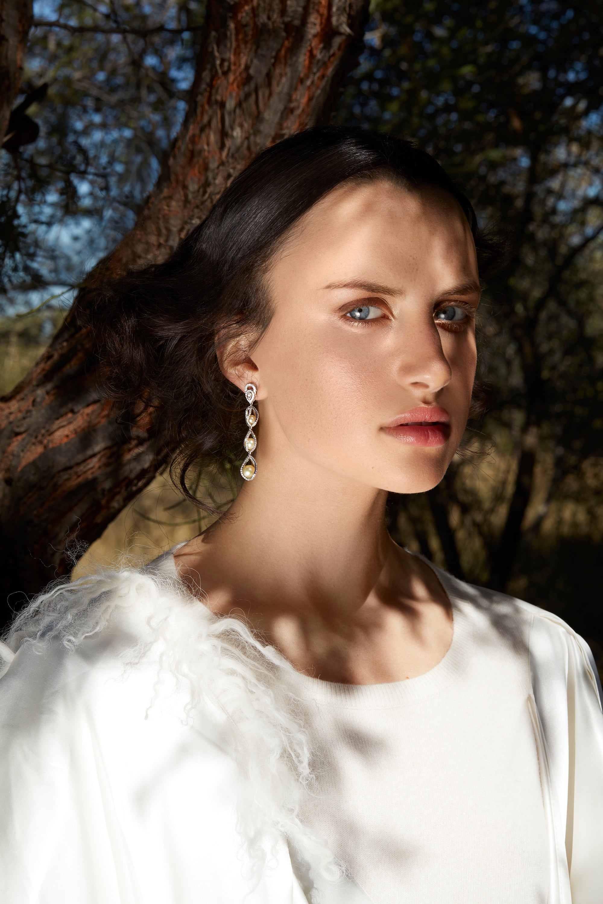 A contemporary and delicate take of our ovoid form. South Sea pearls are encased in paved cage with rose cut diamond solitaires.