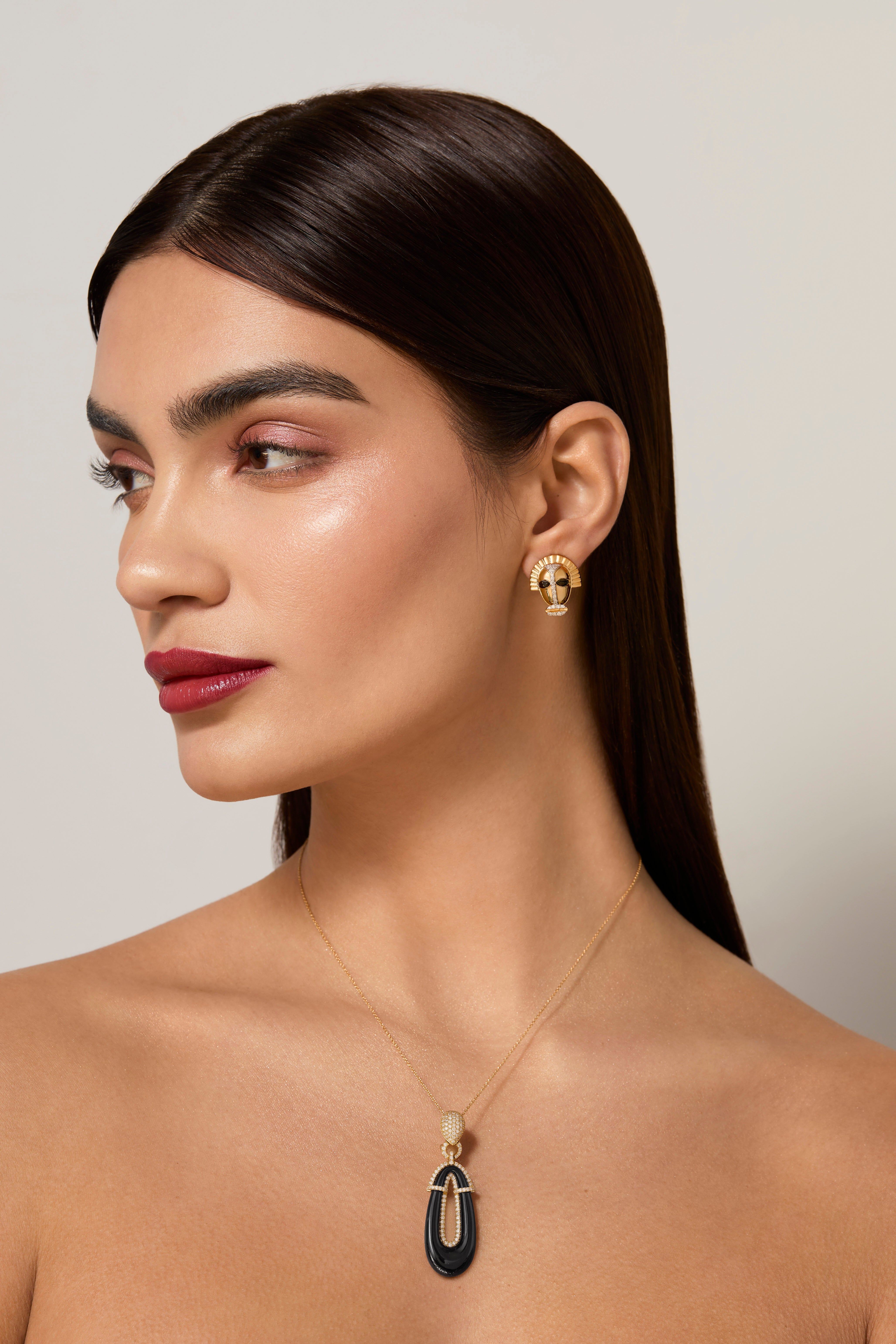 Signature Pengusa silhouette crafted as a pendant, featuring onyx, diamond pavé set in yellow gold.